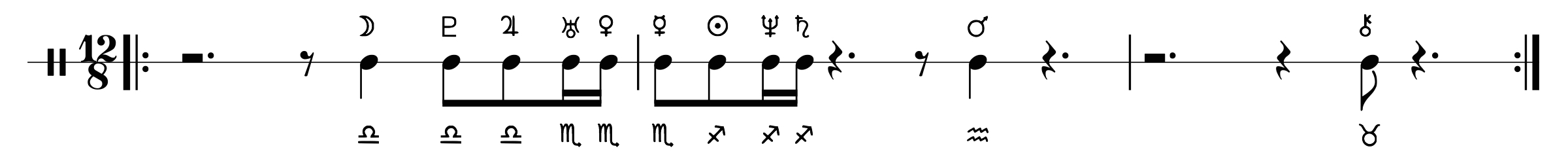 Our multi-composite chart presented patterns from which Pisaura created melodies (Figure 1). The 360-degree chart structure was translated as a 36-beat structure comprised of three measures of 12/8 time (Figure 2). Planets and signs were located within the 36-beat structure as a unique melodic pattern. Instruments were tuned based on esoteric musical systems according to Venus, which was the planetary ruler of our Moon sign, Libra. Specific musical notes that span five octaves were selected according to the tone spiral.